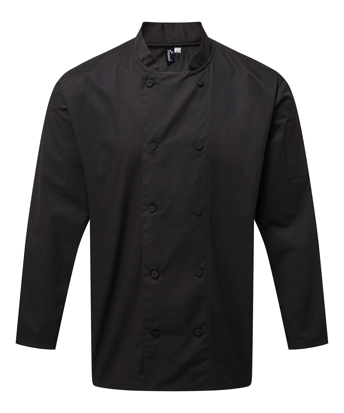 A long sleeve chef's jacket constructed with Coolchecker® fabric. The centre back panel is made from the Coolchecker® fabric which offers exceptional moisture management and wicking properties so chef stays fresh and cool during service. A wrap over fastening with ten self-fabric buttons, a mandarin collar and a useful double pen pocket on the left arm.