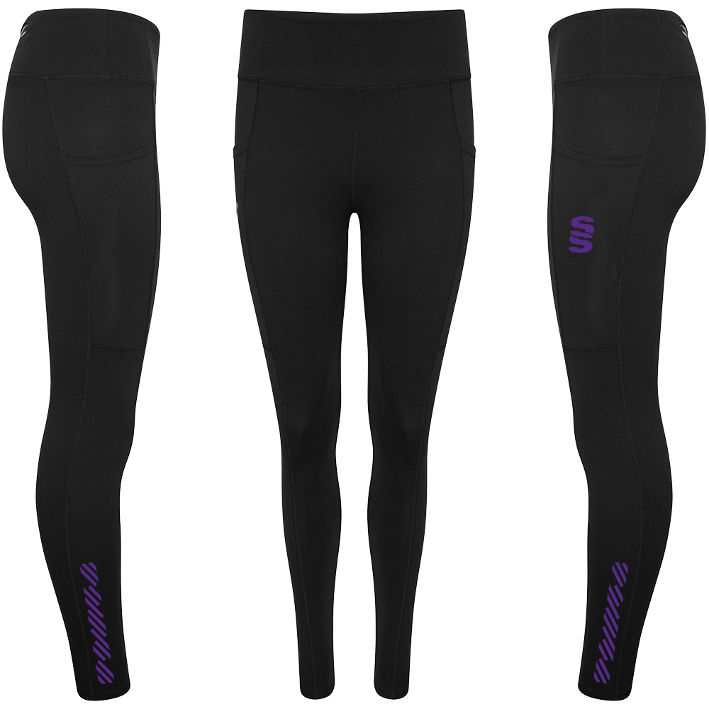 The Performance Full Length Leggings are made of fantastic, comfortable quality  85% Polyester and 15% Elastane. There no grinding on the material when stretched. They feature two side pockets for mobile phones and two smaller pockets (one with zip) for personal belongings, with an inner pocket for a key. To finish, a printed Surridge SS logo is situated on the left thigh.